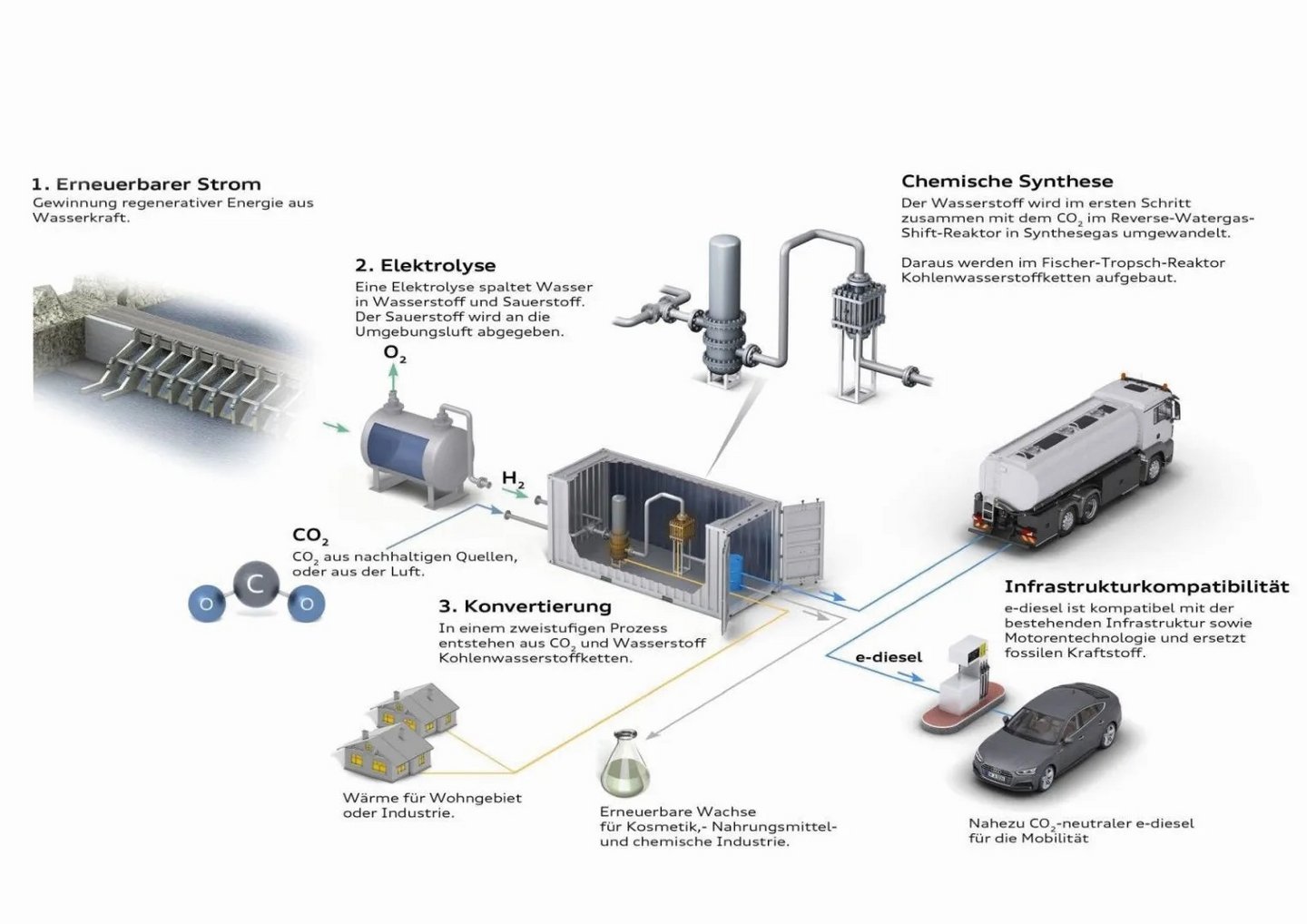 Was genau sind nun E-Fuels? E-Fuels sind synthetische Kraftstoffe, die – vereinfacht gesagt – mittels Strom aus Wasser und CO2 hergestellt werden. Im ersten Schritt wird Wasser per Elektrolyse in seine Bestandteile Wasserstoff und Sauerstoff gespalten. Der gewonnene Wasserstoff wird im nächsten Schritt mit CO2 – das aus der Umgebungsluft gefiltert werden kann – zu Kohlenwasserstoffketten unterschiedlicher Länge verbunden, die wiederum die Basis für die E-Fuels darstellen. In weiteren Schritten bekommt man dann synthetisch hergestellten Treibstoff in den gewohnten Sorten Diesel, Benzin und Kerosin.