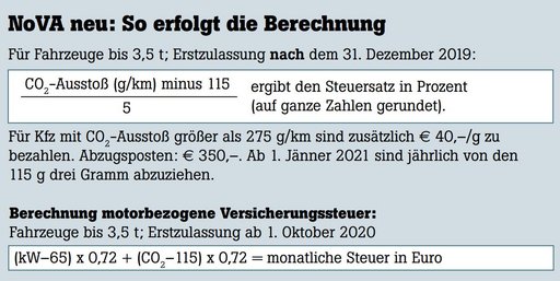 Bei dem nunmehr anzuwendenden WLTP-Messverfahren werden Verbrauch und CO2-Ausstoß anhand realitätsnäherer Messzyklen ermittelt und fallen daher höher aus als im bisherigen NEFZ-Verfahren. Dies hätte einen Anstieg der NoVA um bis zu 25 Prozent zur Folge. Um eine unverhältnismäßige Mehrbelastung der Autofahrer zu vermeiden, wurde nun die NoVA-Berechnung auf neue Beine gestellt (siehe Kasten). Von dieser neuen Formel sollen vor allem verbrauchsarme Fahrzeuge profitieren.