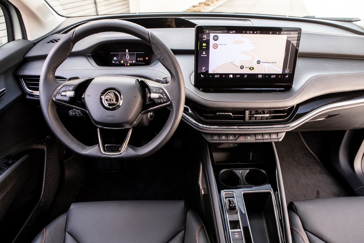 Es hat eingeschlagen. Der Blitz in den Antrieb. Und das ganze Auto in den Markt. Wer jetzt einen Enyaq iV bestellt, wird mit einer Auslieferung Anfang 2022 zu rechnen haben. Ob der Hype nun gerechtfertigt scheint, ist eine Frage der inneren Einstellung. Nachvollziehbar ist es dennoch, ist doch der Enyaq iV einer der ersten puren Elektriker, die preislich auf Augenhöhe mit vergleichbaren Verbrennern liegen. Mit 4,65 Metern Länge ist der Enyaq etwa auf Augenhöhe mit dem SUV Kodiaq und dem Kombi Octavia – und gesamt gesehen ist er auch eine Mischung aus diesen beiden Fahrzeuggattungen. Dank seiner üppigen Felgen (je nach Ausstattungsvariante 18-21 Zoll Serie) ist nicht nur seine Außenwirkung mächtig. Richtig spannend wird es nach dem Einsteigen: Durch den Wegfall des Mitteltunnels ergeben sich vielfältige Gestaltungsmöglichkeiten des Interieurs. Skoda hat an dieser Stelle eine in mehrere Ebenen angelegte Instrumententafel sowie eine Mittelkonsole mit üppigen Ablagemöglichkeiten hineinkonstruiert, was gesamt eine unglaubliche Luftigkeit suggeriert, die sich auch auf den hinteren Plätzen zeigt. Dominiert wird das Ganze vom üppigen, freistehenden 13-Zoll-Touchscreen des Infotainmentsystems. Die eigentlichen Armaturen werden auf einem verhältnismäßig kleinen 5,3-Zoll-Display dargestellt, welches (im Gegensatz zum Konzernkollegen VW iD4) schlüssig ins Armaturenbrett integriert ist. Das ist auf den ersten Blick etwas ungewohnt, stört im täglichen Leben aber überhaupt nicht, denn bis auf Geschwindigkeit und Ladestand möchte man zumeist ohnehin nichts wissen.