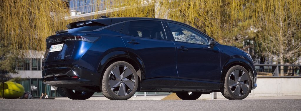 Pearl Blue nennt sich das noble Dunkelblau unseres neuen Dauergasts Nissan Ariya. Der vollelektrische Coupé-Crossover markiert das Elektro-Topmodell der japanischen Marke, die seinerzeit mit dem Leaf wichtige Elektro-Pionierarbeit geleistet hat. Dementsprechend stylish präsentiert er sich in feinem Designerlook.