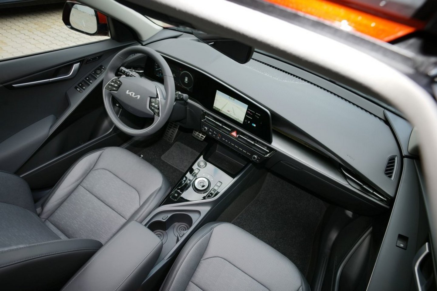 Auch drinnen gibt sich der Niro selbsterklärend. Man nimmt Platz, drückt den Startknopf, dann den Getriebewahlhebel, der wie ein fetter Lautstärkendrehregler einer Stereoanlage ausgeführt ist, auf D – und los geht’s. Angerollt wird zumeist elektrisch, erst später meldet sich der Verbrenner geräuscharm dazu. Die Lenkung ist am Punkt, das Fahrwerk eher auf der angenehm komfortablen Seite, lediglich das Bremspedal fühlt sich – wie bei vielen Hybriden – ein wenig teigig an. Man kann das Bremsen jedoch mit den Schaltwippen beeinflussen: Hier lässt sich der Rekuperationsgrad in drei Stufen verstellen – so kann das Bremspedal beinahe unberührt bleiben. Wer jetzt instinktiv bei der Nachrichtensignation nach dem Drehregler greift, um lauter zu drehen, dem kann passieren, dass er danach ins Schwitzen kommt: Die beiden Drehregler sowie der Touchscreen in der Mittelkonsole teilen sich die Bedienung für die Heizung und die Multimediaeinheit. Ein Touchfeld schaltet zwischen den beiden Ebenen hin und her.