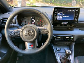 Auch der Antrieb ist no-nonsense: Das Mitteldifferenzial des Allradantriebs ist mit einer Lamellenkupplung versehen, welche eine Drehmomentverteilung zwischen Vorder- und Hinterachse möglich macht -umgeschalten wird per Drehregler links vorm Schalthebel. Im Normalmodus beträgt die Kraftverteilung 60 Prozent vorne zu 40 Prozent hinten, was das Fahrverhalten untersteuernd auslegt wie bei einem Fronttriebler. „Sport“ schickt 70 Prozent der Kraft an die Hinterachse, was den einen oder anderen Heckschwenk zulässt - ganz Mutige können damit im Drift Kurven ausschmieren. Seriös wird es wieder im „Track“-Modus, wo die Kraftverteilung 50:50 ausfällt. Hier ist die Fahrtechnik entscheidend, wie man den Wagen um die Kurve bringen will. Wer mit dem GR bei Trackdays teilnehmen möchte, dem sei die High Performance-Version (plus 5300 Euro) ans Herzen gelegt: Dann gibt es Torsen-Sperrdifferenziale an Vorder- und Hinterachse, geschmiedete Leichtmetallfelgen mit Michelin Pilot Sport 4S-Reifen und rot lackierte Bremssättel dazu.